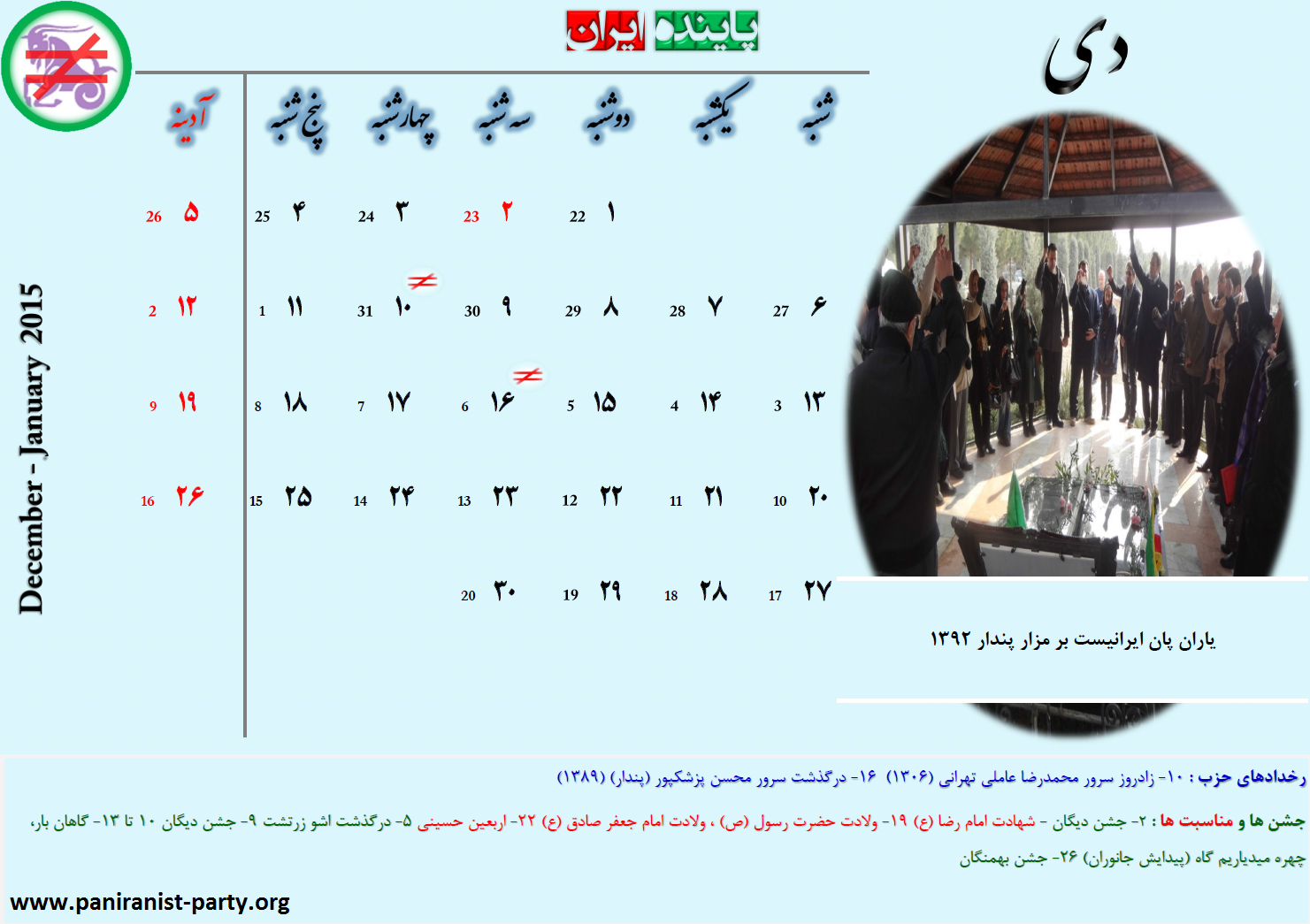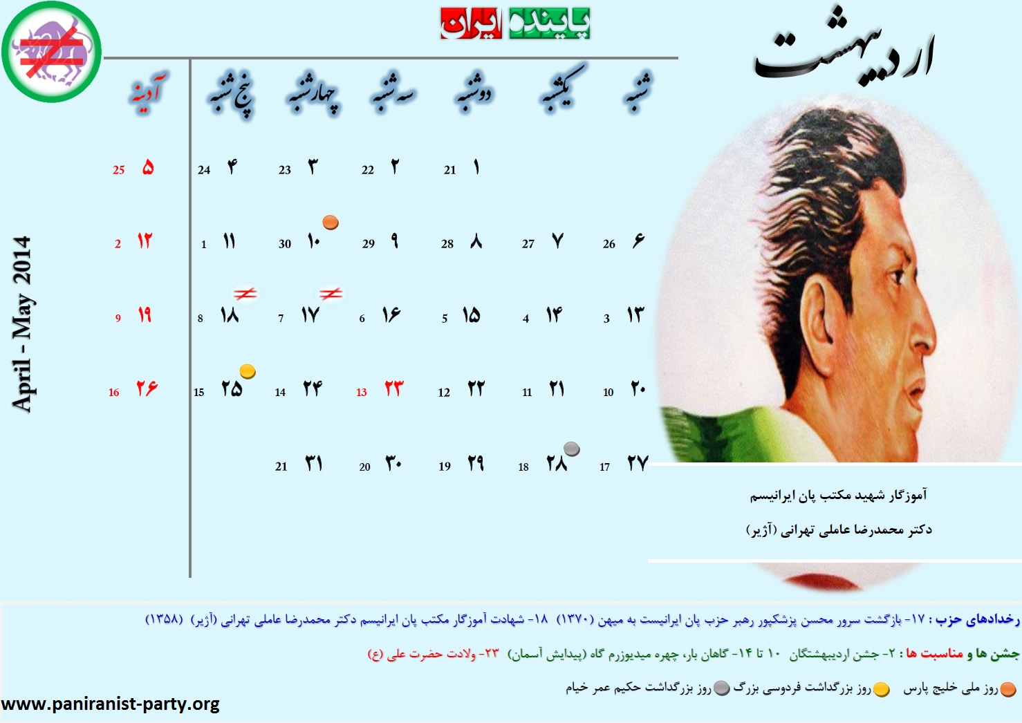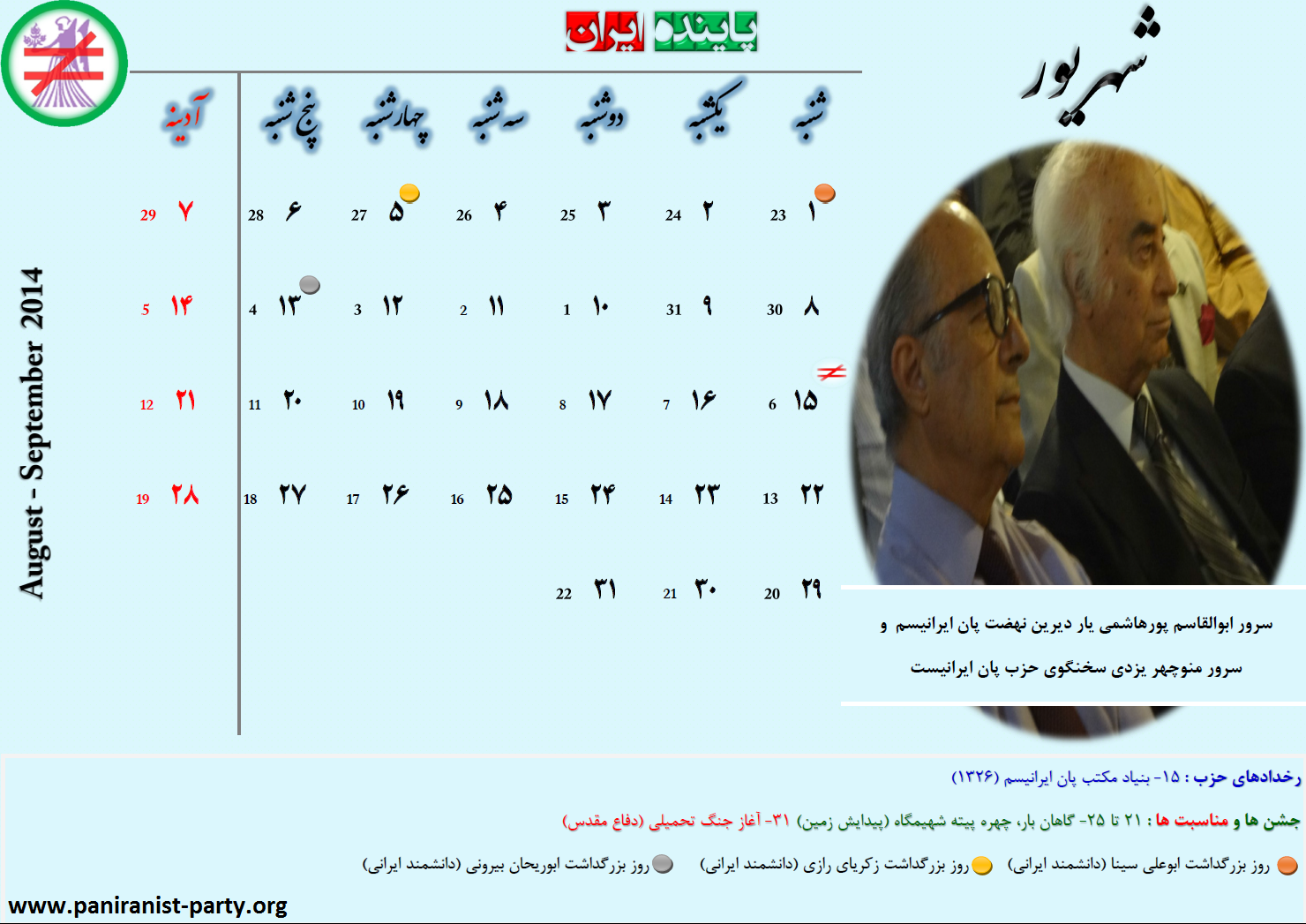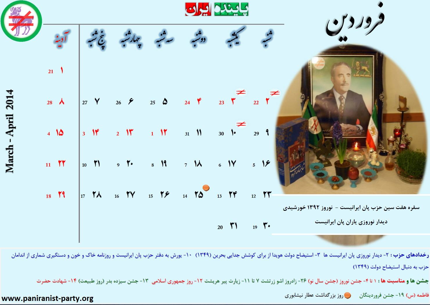 نوروز امسال نیز همچون سال گذشته جوانان آرمان خواه و خوش ذوق پان ایرانیست دست به کار شدند و سالنمای پان ایرانیستی سال 1393 را تهیه کردند. از ویژگی های این سالنما همراه داشتن مناسبت های پان ایرانیستی و ملی در کنار مناسبت های تقویم رسمی کشور است. این سالنما همچنین مزین به تصاویر پان ایرانیستی، از گذشته تا به امروز است. این سالنما را می توانید در فرمت png (عکس) دریافت کنید. برای دیدن تصاویر در سایز بزرگ و کیفیت بالا روی آن ها کلیک کنید. |