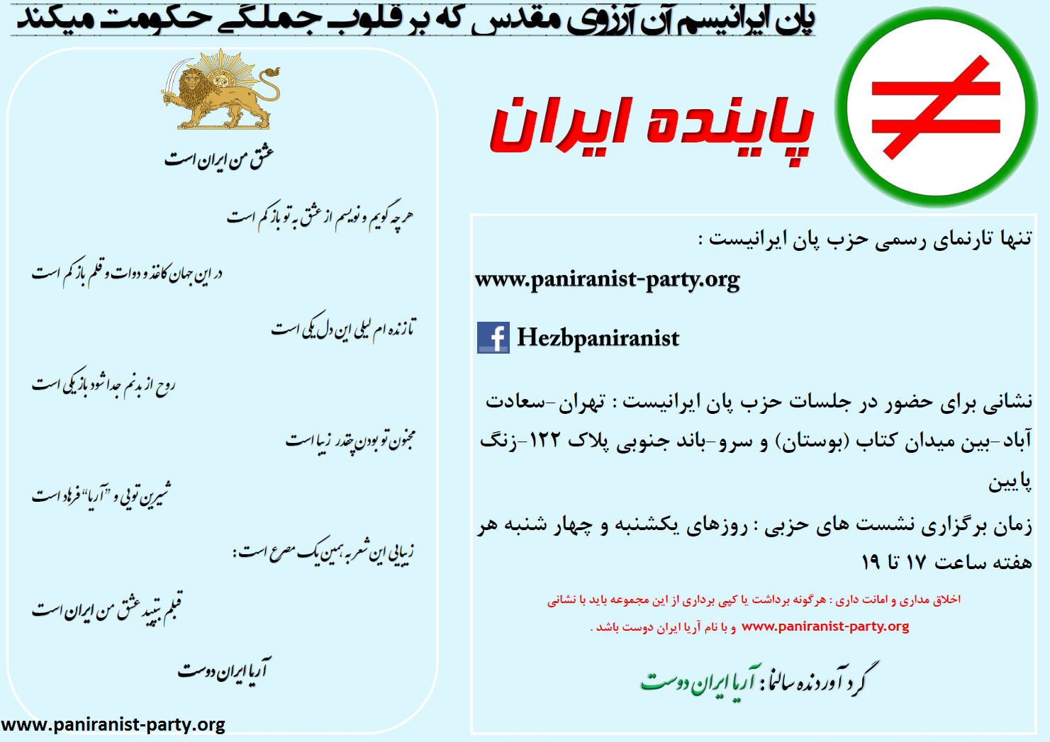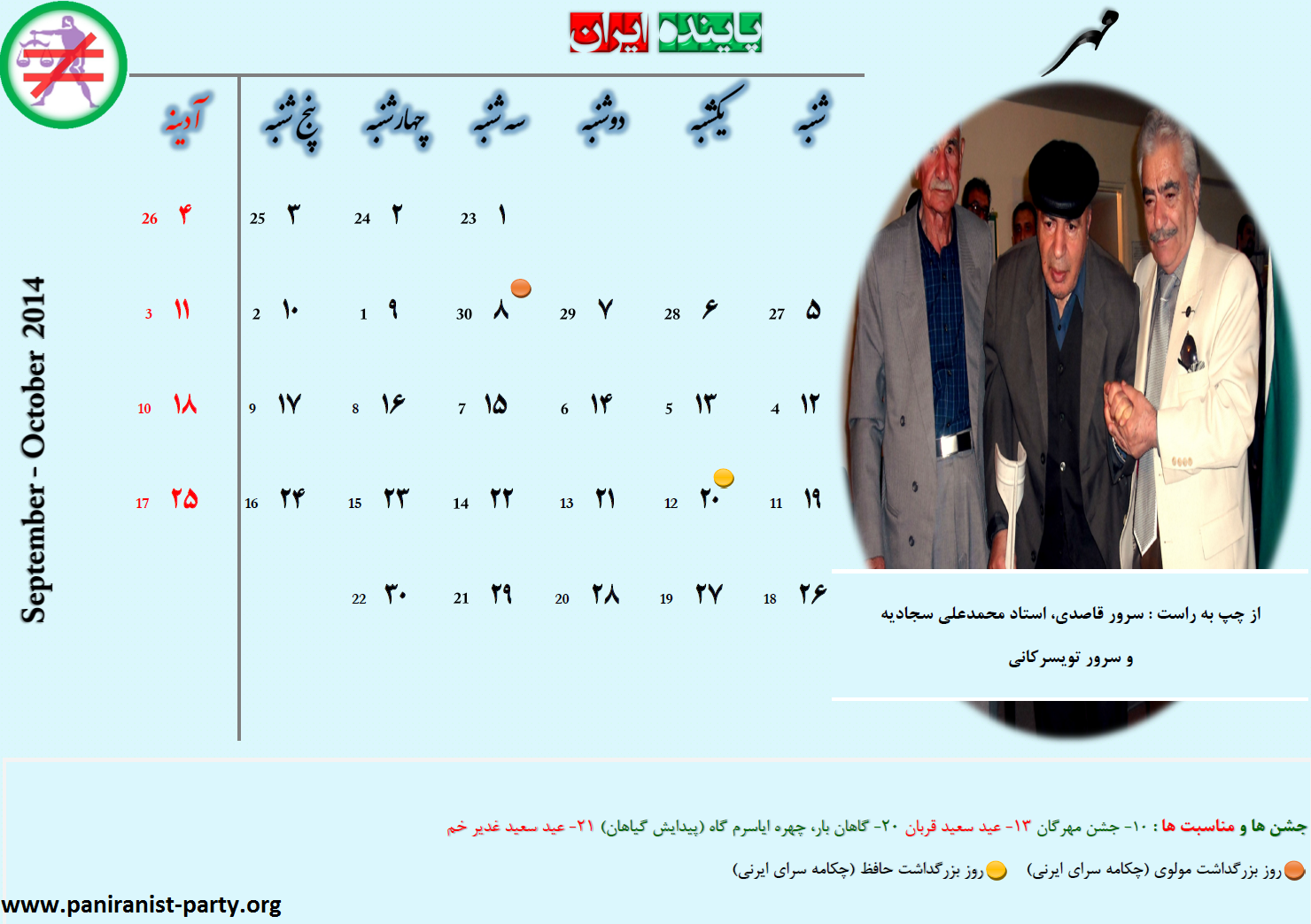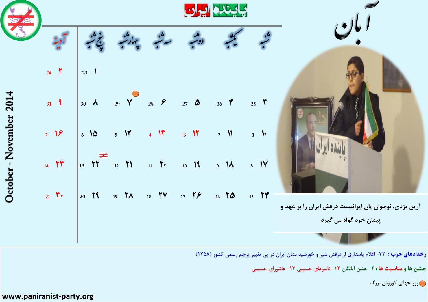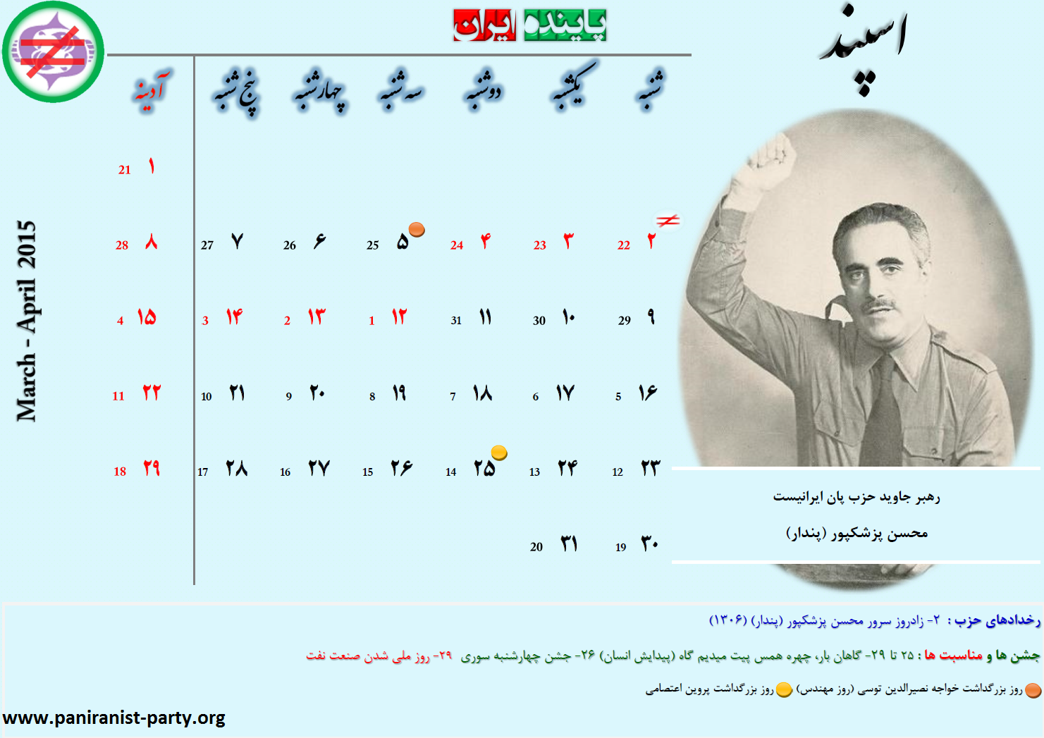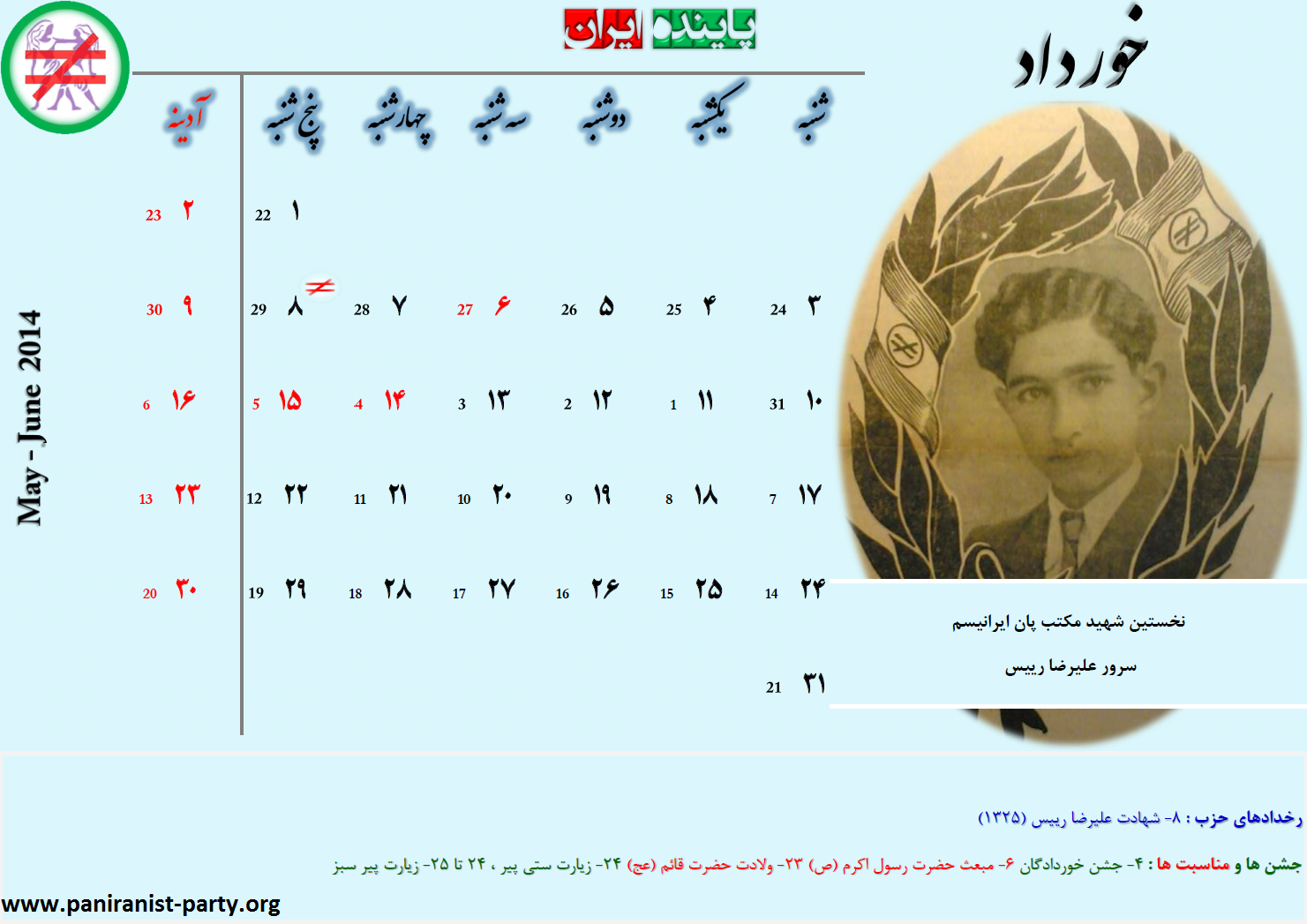 نوروز امسال نیز همچون سال گذشته جوانان آرمان خواه و خوش ذوق پان ایرانیست دست به کار شدند و سالنمای پان ایرانیستی سال 1393 را تهیه کردند. از ویژگی های این سالنما همراه داشتن مناسبت های پان ایرانیستی و ملی در کنار مناسبت های تقویم رسمی کشور است. این سالنما همچنین مزین به تصاویر پان ایرانیستی، از گذشته تا به امروز است. این سالنما را می توانید در فرمت png (عکس) دریافت کنید. برای دیدن تصاویر در سایز بزرگ و کیفیت بالا روی آن ها کلیک کنید. |